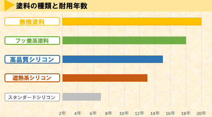 そしてフッ素塗料や無機塗料など耐用年数がとても長い塗料があり、シリコン塗料と比べると1回でかかる費用は高いです。