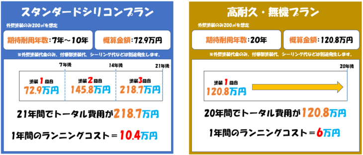 しかし20年のトータル費用を比べてみると、97.9万円も高耐久・無機プランの方がお安くなっております。