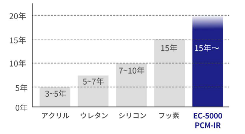 EC-5000PCM-IRは、一般的なアクリル樹脂より50~100倍大きなピュアアクリル樹脂を使用しており、紫外線による破壊ポイントとなる結合箇所が少ないため、耐候性の高い塗膜を形成します。
