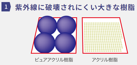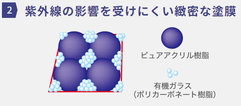 光・雨・温度の変化や衝撃に強く壊れにくい有機ガラスを配合し、塗膜の緻密性を高めていることにより、紫外線が塗膜内に入り込みにくくなり、耐候性を維持することができます。