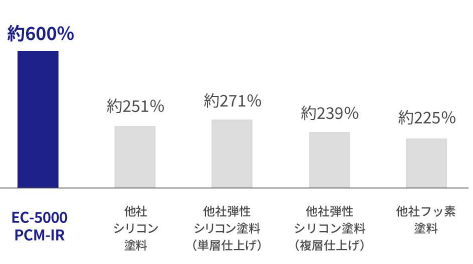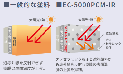 EC-5000PCM-IRはナノセラミック粒子の配合と遮熱顔料の添加により、太陽光波長のうち温度上昇の原因となる近赤外線(波長780~2500nm)を効果的に反射する塗膜を形成。室内温度の上昇を抑え、生活環境の快適化に貢献します。