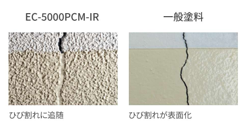 一般塗料の場合、塗膜がひび割れに追随できずに防水性を失ってしまいますが、EC-5000PCM-IRは優れた伸長性で、ひびを表面化させず、水の浸入を抑制します。