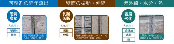 シーリング材が劣化する原因は、数種類の劣化因子によって引き起こされます。