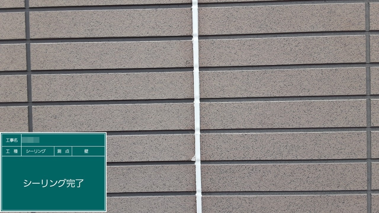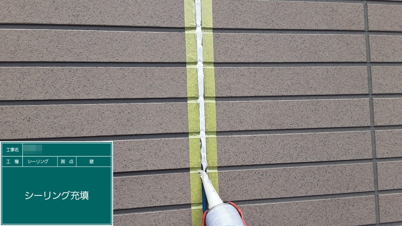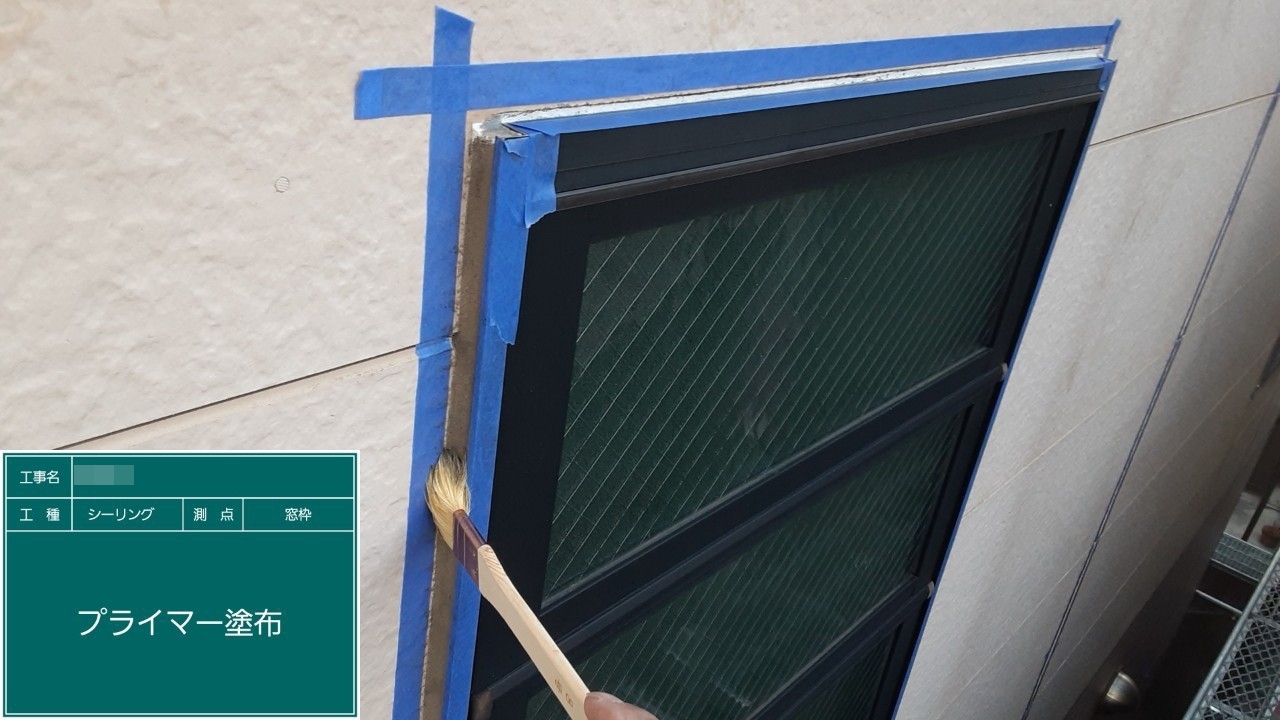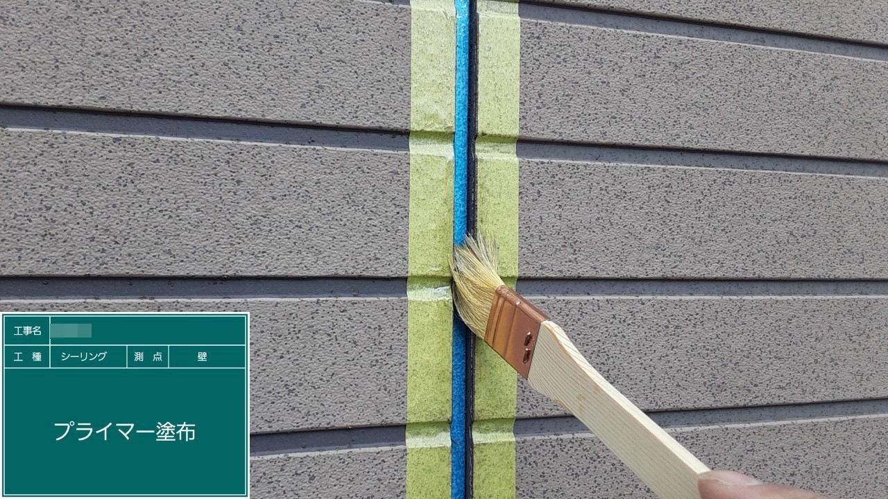 シーリング工事です。既存のシーリング材を撤去し、プライマーを塗布しています。