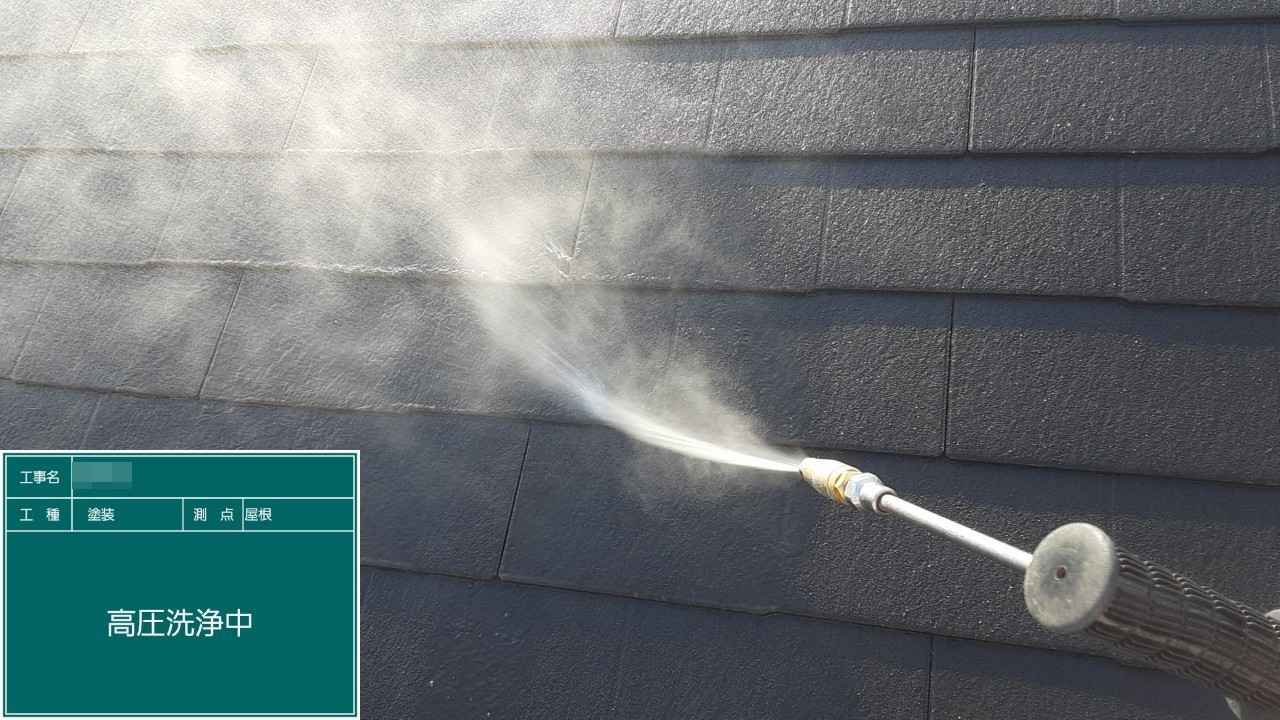 高圧洗浄機で苔や汚れをきれいに落としていきます。
