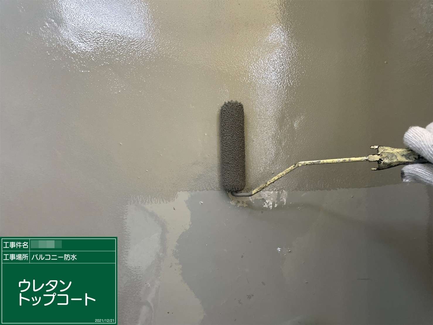 ベランダ防水・トップコート施工中