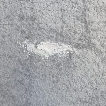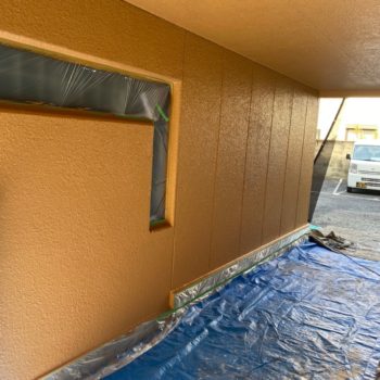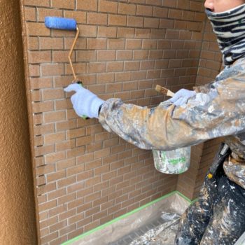 外壁上塗り施工中 上塗りは中塗りがしっかり乾いたら塗布量を確認しながら塗っていきます。