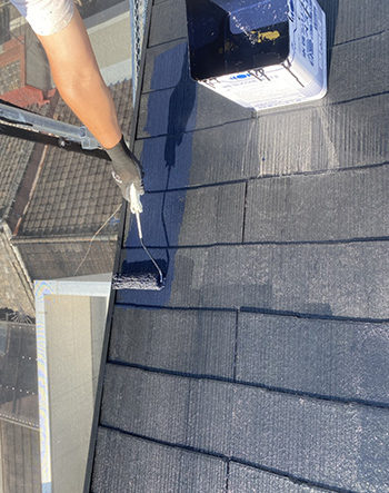 上塗り中の屋根の様子です。三度塗ることで、しっかり発色するようになりました。
